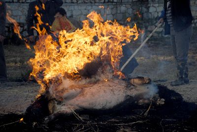 / Z ]0 h2 Q, l5 E! l1 {: R* M大理白族人民逢年过节或红白喜事时把猪宰杀后,用稻草火将整个肥猪烧成焦黑。然后用水冲洗猪体,再用刀将焦黑的毛皮刮去,刮洗后的肥猪整体呈金黄色,散发出一股股清香味。最后开膛破肚,将肥猪分割成若干块,待烹调食用。白族人民还有吃生皮的习惯,即将火烧猪肉(多用臀部和后腿皮肉)和猪肝切成细丝,以葱、辣子面、酱油等为佐料,调蘸而食。此吃法民间称之为“吃生皮”,相传始于南诏时期。2010年2月和2011年4月摄于云南省大理市喜洲沙村。
