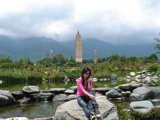 3 N! W$ b0 l K; C) a* H1 Z0 s吃完饭我们打车去三塔公园,里面也是个寺,叫做崇圣寺,有3座塔。公园非常大,门口进去有个非常专业的游客服务中心,可以寄放行李、借电子导游等等,厕所也非常干净非常大,简直媲美5星级酒店的厕所了,哈哈。本来以为公园走走就可以了,后来发觉还是要坐他们的电瓶车的,因为后面的路都是阶梯,用走的真的很累。所以我们也就没有去成之后的寺庙,只是看了看前面的景点,但也花了将近2个小时。。。不过景色还真的是不错的,特别是前面有个湖,可以映出3个塔的倒影,成为6座塔,在这里拍照,感觉很好。